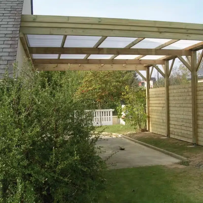 Nos carports sont montés sur place par nos soins, ou livrés sous forme de kit. Il est également possible d’avoir la fourniture seule non usinée.