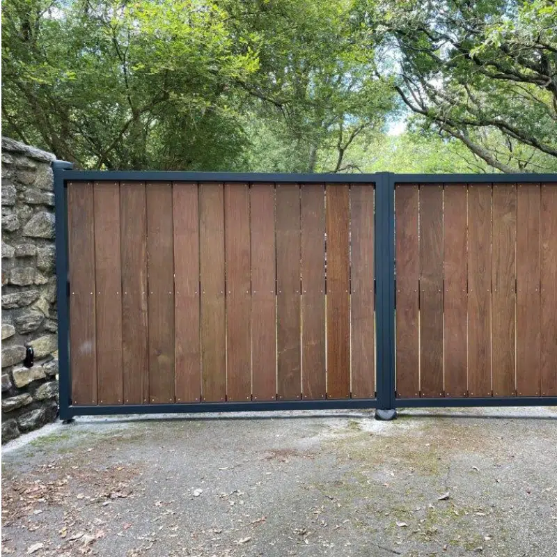Un portail robuste et élégant associant structure métallique et remplissage bois pour une entrée naturelle, durable et sécurisée.